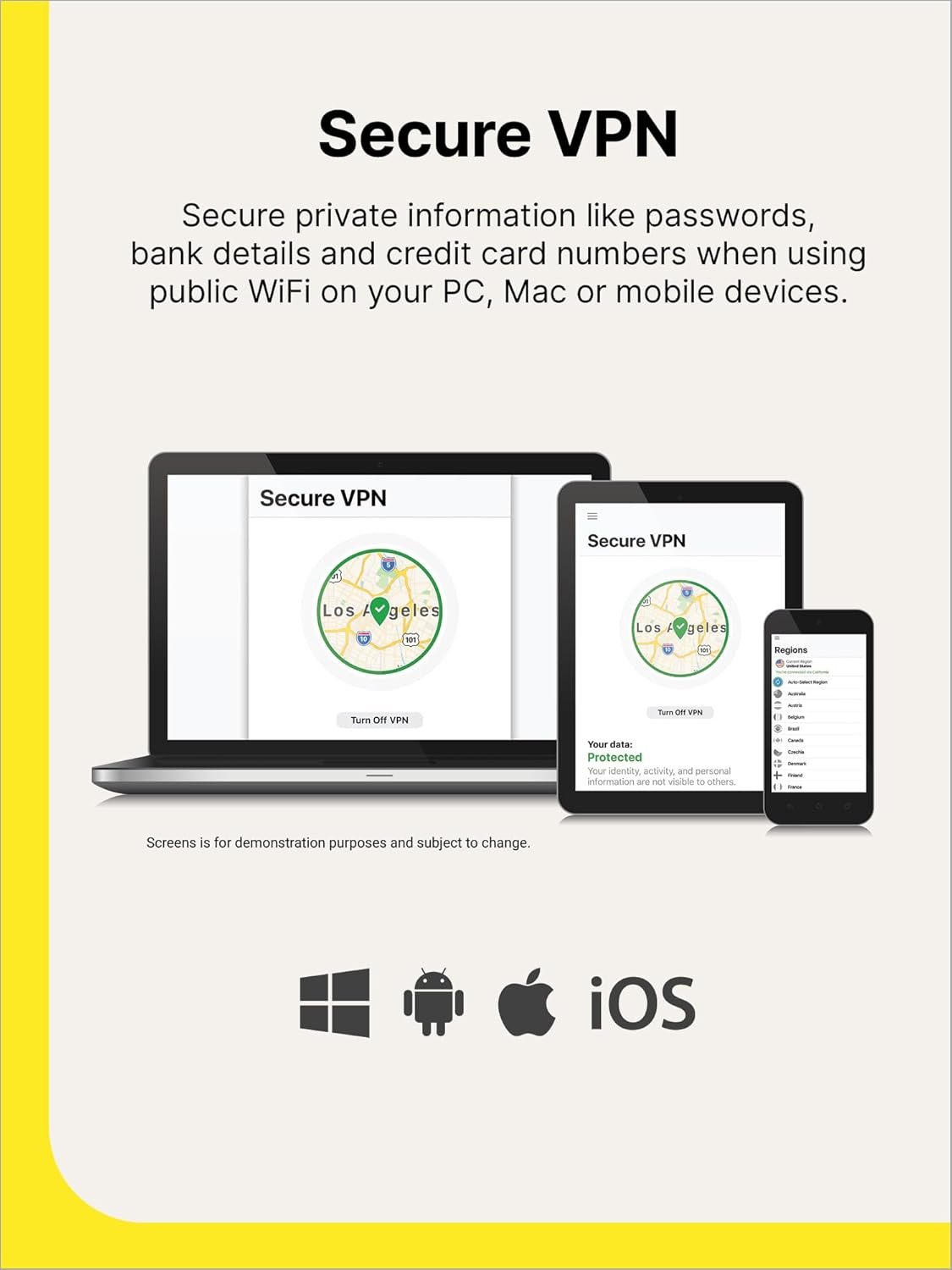 Secure Private Information Protects sensitive data such as passwords, bank details, and credit card numbers on public Wi-Fi